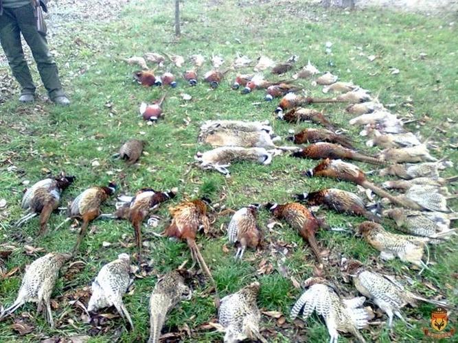 灵缇犬抓野鸡兔子,一只手拿着猎枪,另一只手拿着一个网兜,网兜里装着野鸡兔子。