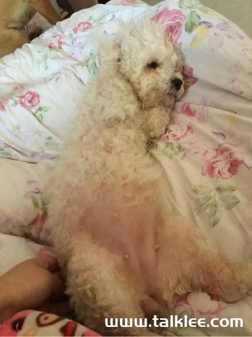 母犬发情的表现:阴部红肿,有少量血液流出,狗狗不停舔阴部。